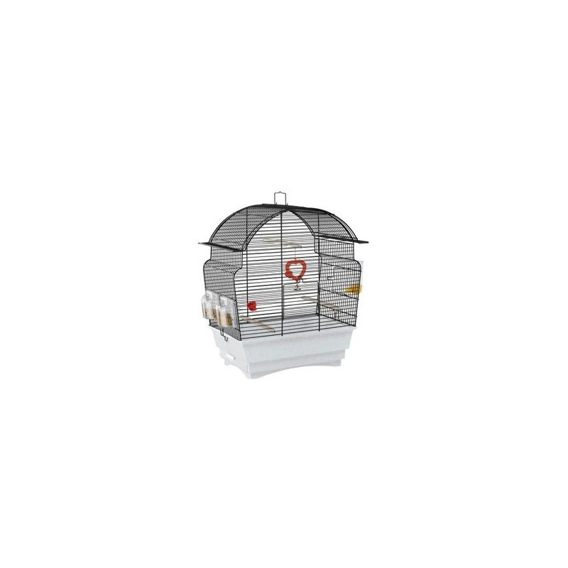 Équipée de tous les accessoires pour accueillir vos oiseaux : 2 mangeoires Brava 1, abreuvoir, 3 perchoirs et un jouet miroir avec une petite cloche.