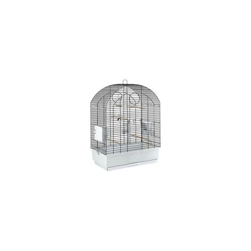 Equipé de perchoirs, d’un miroir et de deux mangeoires.