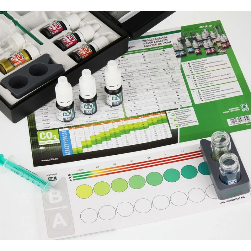 Utilisation : Remplir l’éprouvette d’eau de l’aquarium avec la seringue, ajouter l’indicateur et comparer la couleur avec le nuancier ou pour le test KH, compter les gouttes jusqu’au changement de couleur.