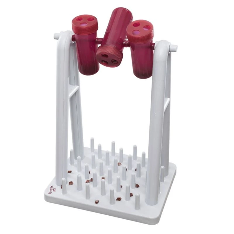 En effet, le chat devra faire tourner les trois éléments pour libérer des friandises ou croquettes. Et pour compliquer la chose, les friandises tombent sur un support constitué de cônes. Il faudra alors trouver le moyens de les récupérer.
